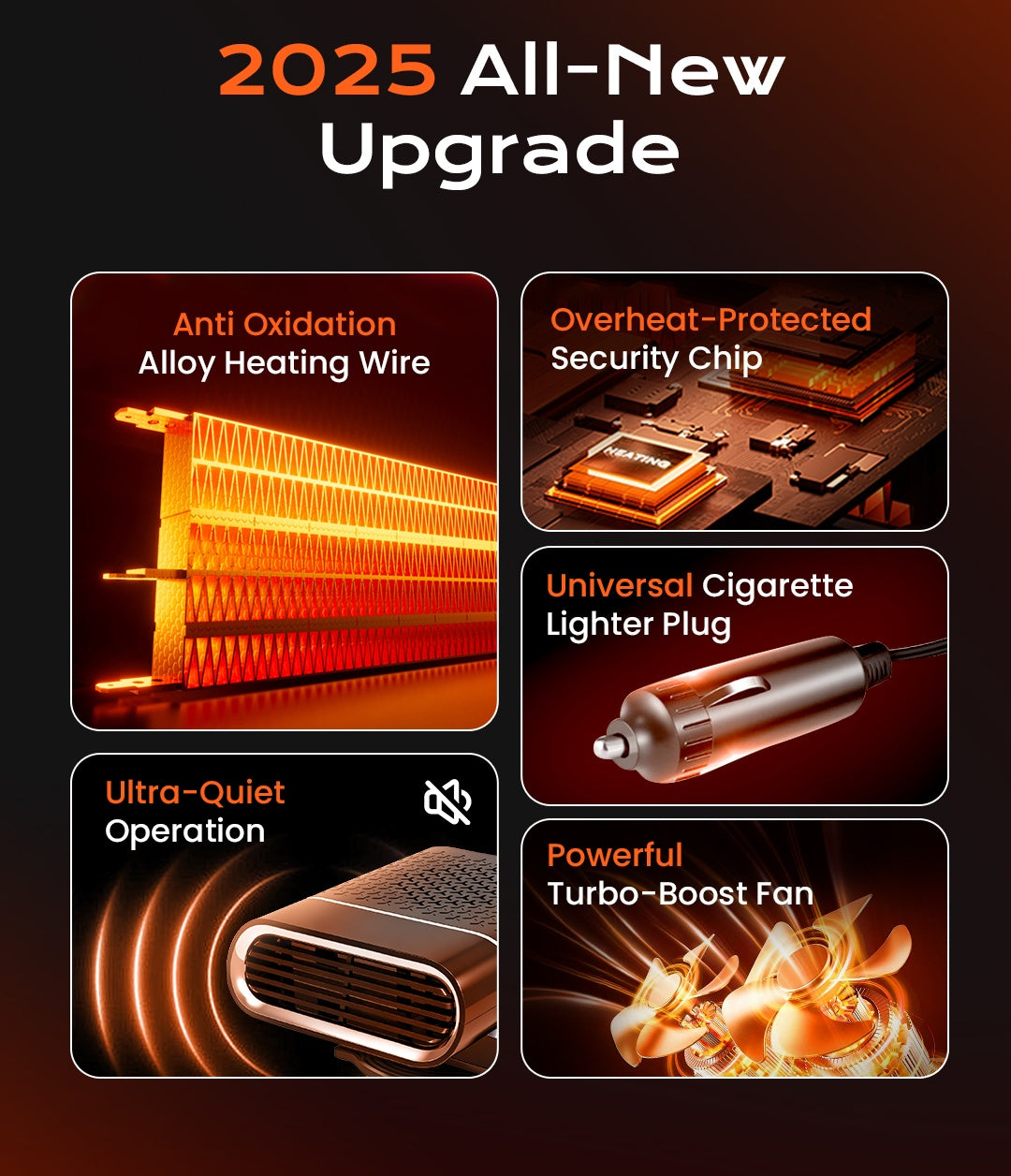 HITRO ODTAJANJE IN OGREVANJE: Ta avtomobilski grelnik z ogrevalnim žico iz antioksidacijske zlitine zagotavlja topel zrak v samo 30 sekundah. Hitro odstrani ivje, meglo in vlago z vetrobranskega stekla, stranskih in zadnjih oken, kar vam omogoča jasen pogled med vožnjo in zagotavlja toplo kabino pozimi.