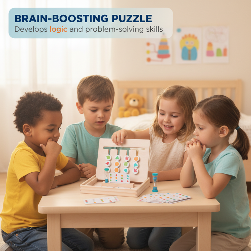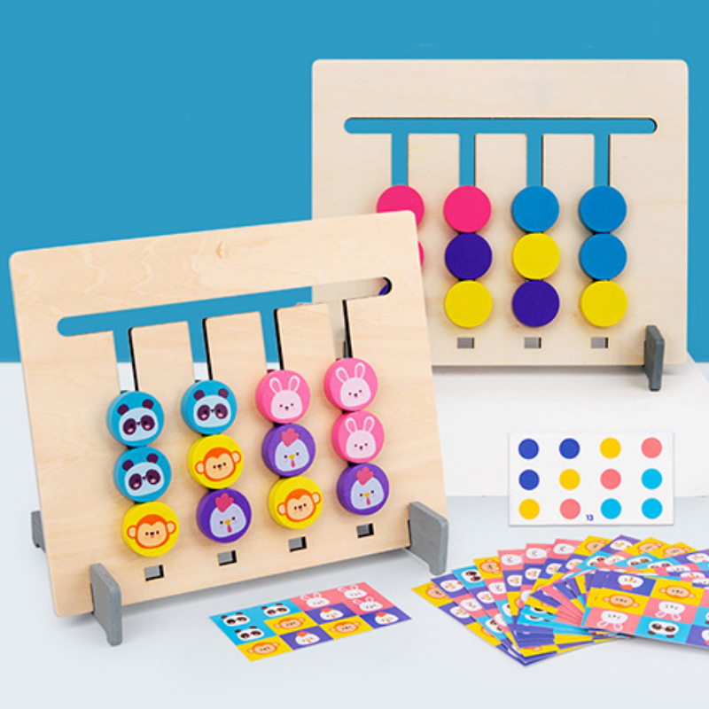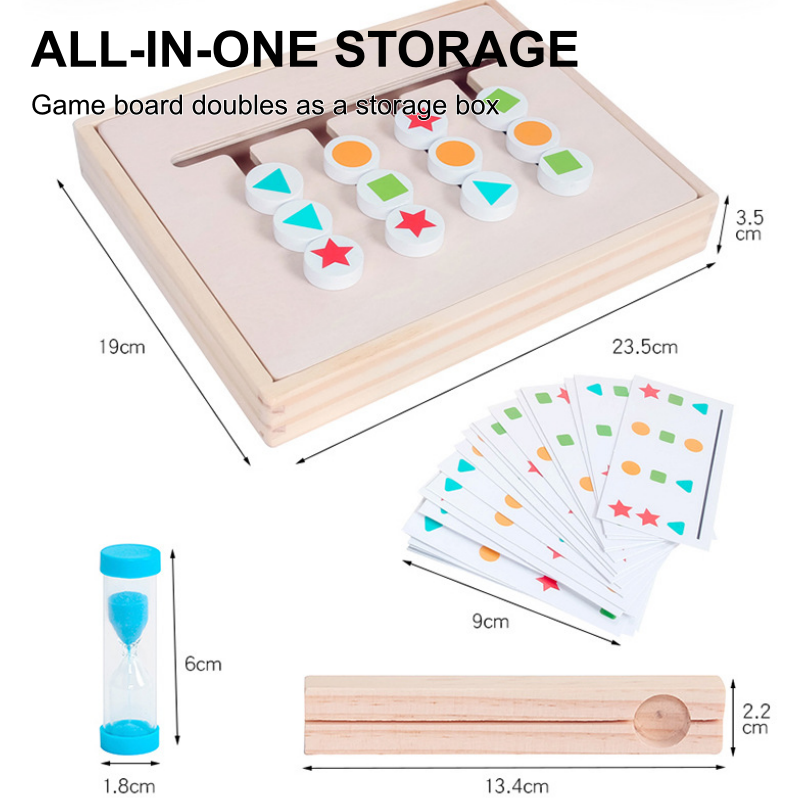 RAZVOJ KOGNITIVNIH SPOSOBNOSTI – Izboljšuje prepoznavanje barv in oblik, sposobnosti reševanja problemov in logično mišljenje. Otroci premikajo kose, da se ujemajo z vzorci na karticah, kar jim ponuja zabavno, praktično učno izkušnjo.